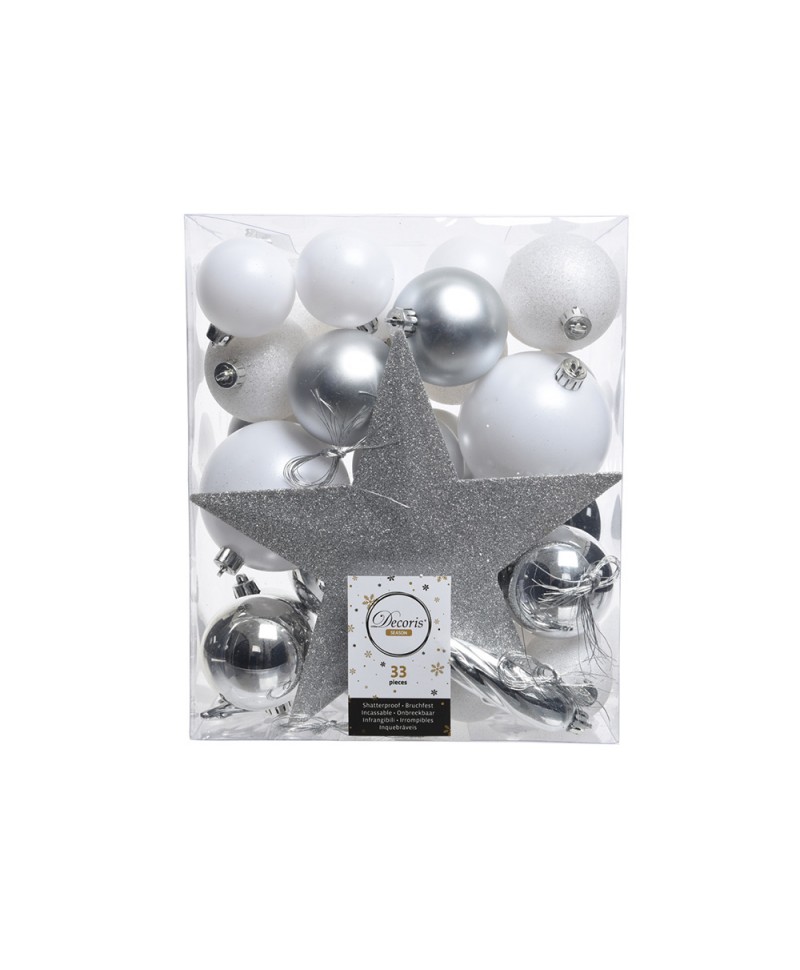 CAIXA DE 33 ACESSÓRIOS PARA ÁRVORE PRATEADO E BRANCO. INCLUI 1: ESTRELA PRATEADA, 2 BOLAS PRATEADAS E 2 BOLAS BRANCAS DE 8CM. 6 BOLAS PRATA BRILHANTE DE 6CM. 6 BOLAS PRATA MATE DE 6CM E 6 BRANCAS. 4 BOLAS BRANCAS E 3 BRANCAS BRILHANTES DE 5CM E 3 FIGURAS DE ESTALACTITES PRATA. INCLUI CABO PARA PENDURAR